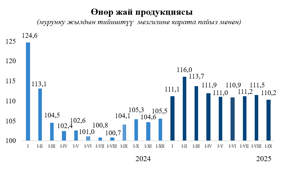 Өнөр жай өндүрүшүнүн өсүшү 2024-жылдын январь-сентябрына салыштырмалуу фармацевтикалык продукциялардын (2,3 эсеге), тамак-аш азыктарын (суусундуктарды кошкондо) жана тамеки азыктарын өндүрүүнүн (40,1 пайызга),резина,пластмасса буюмдарын жана курулуш материалдарын өндүрүүнүн (31,8 пайызга),жыгачтан жана кагаздан жасалган буюмдарды өндүрүүнүн, полиграфиялык ишмердүүлүк продукцияла-рынын (28,7 пайызга), химиялык продукциялардын (17,7 пайызга), текстиль өндүрүшүнүн, кийим өндүрүрүшүнүн (8,5 пайызга), ошондой эле пайдалуу кендерди казып алуу (16,3 пайызга) көбөйүшү менен камсыздалды.