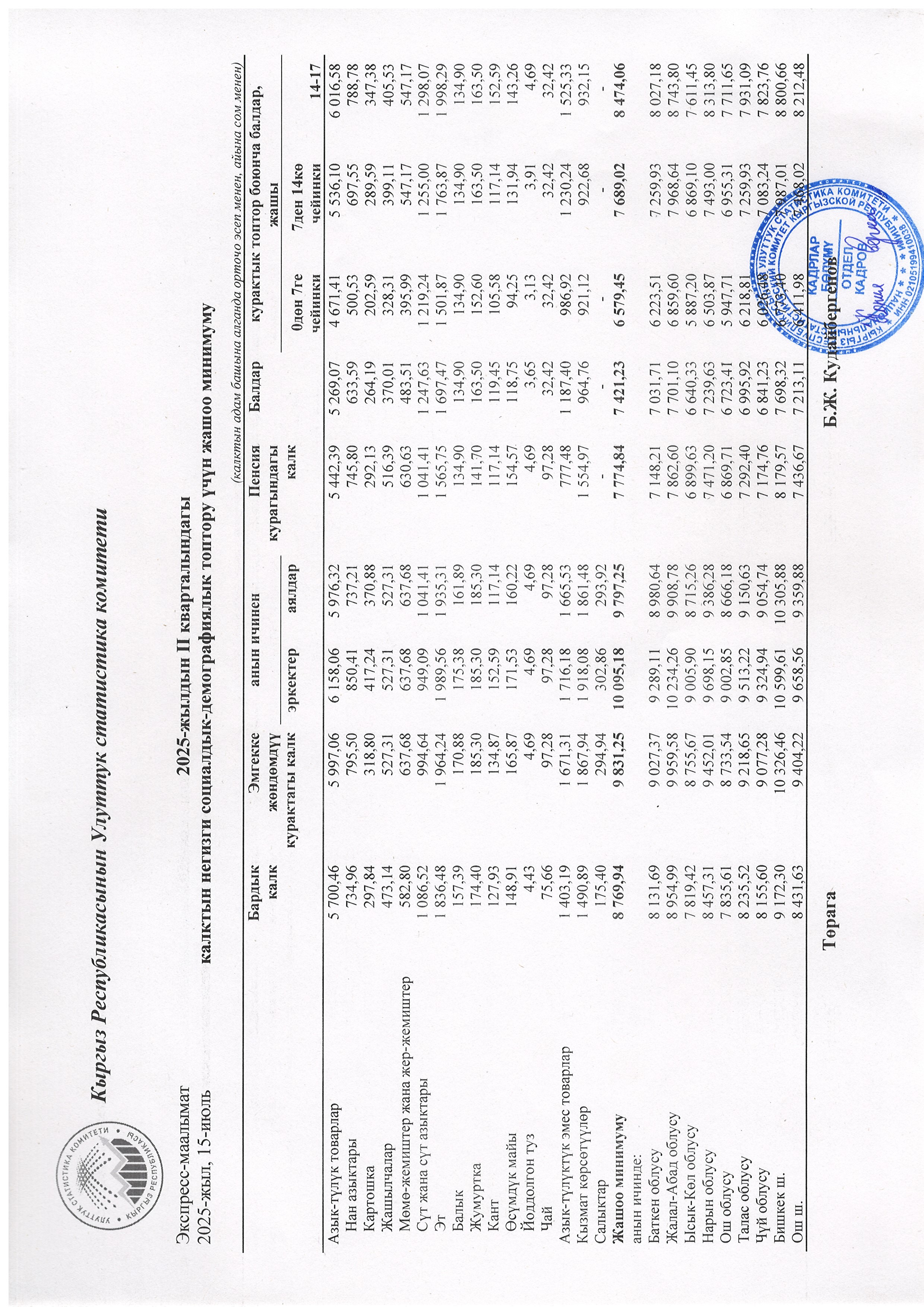 2025-жылдын II-кварталындагы калктын негизги социалдык-демографиялык топтору учун жашоо минимуму