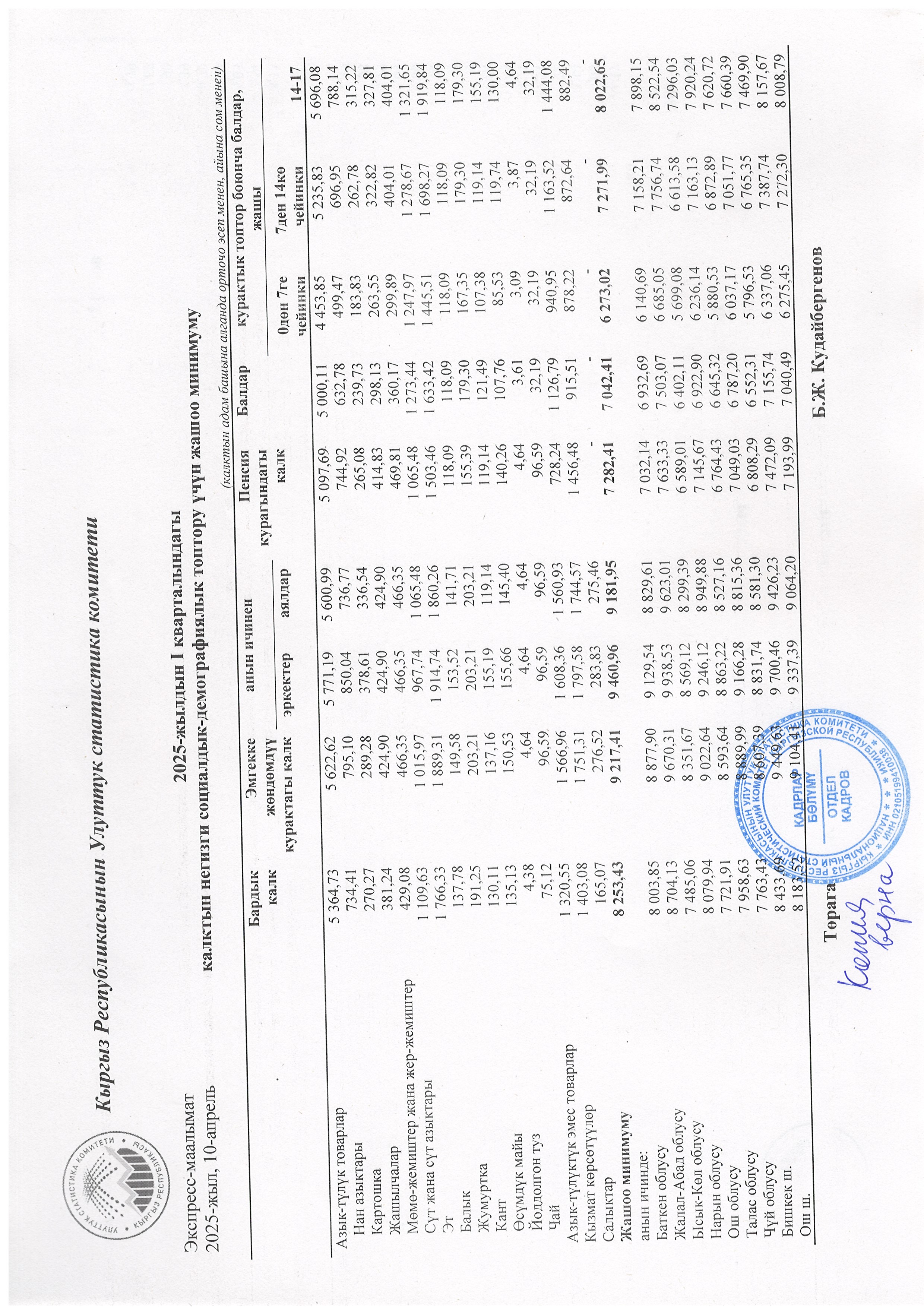 2025-жылдын I-кварталындагы калктын негизги социалдык-демографиялык топтору учун жашоо минимуму