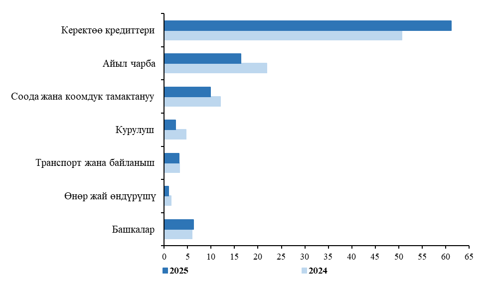 Үстүбүздөгү жылдын I жарым жылдыгында берилген микрокредиттердин жалпы көлөмүнүн 60 пайыздан ашыгы керектөө муктаждыктарына берилди, 16 пайыздан ашыгы - айыл чарбасындагы ишмердикти өнүктүрүүгө жана 10 пайызга жакыны - соода жана коомдук тамактануу чөйрөсүнө багытталды.