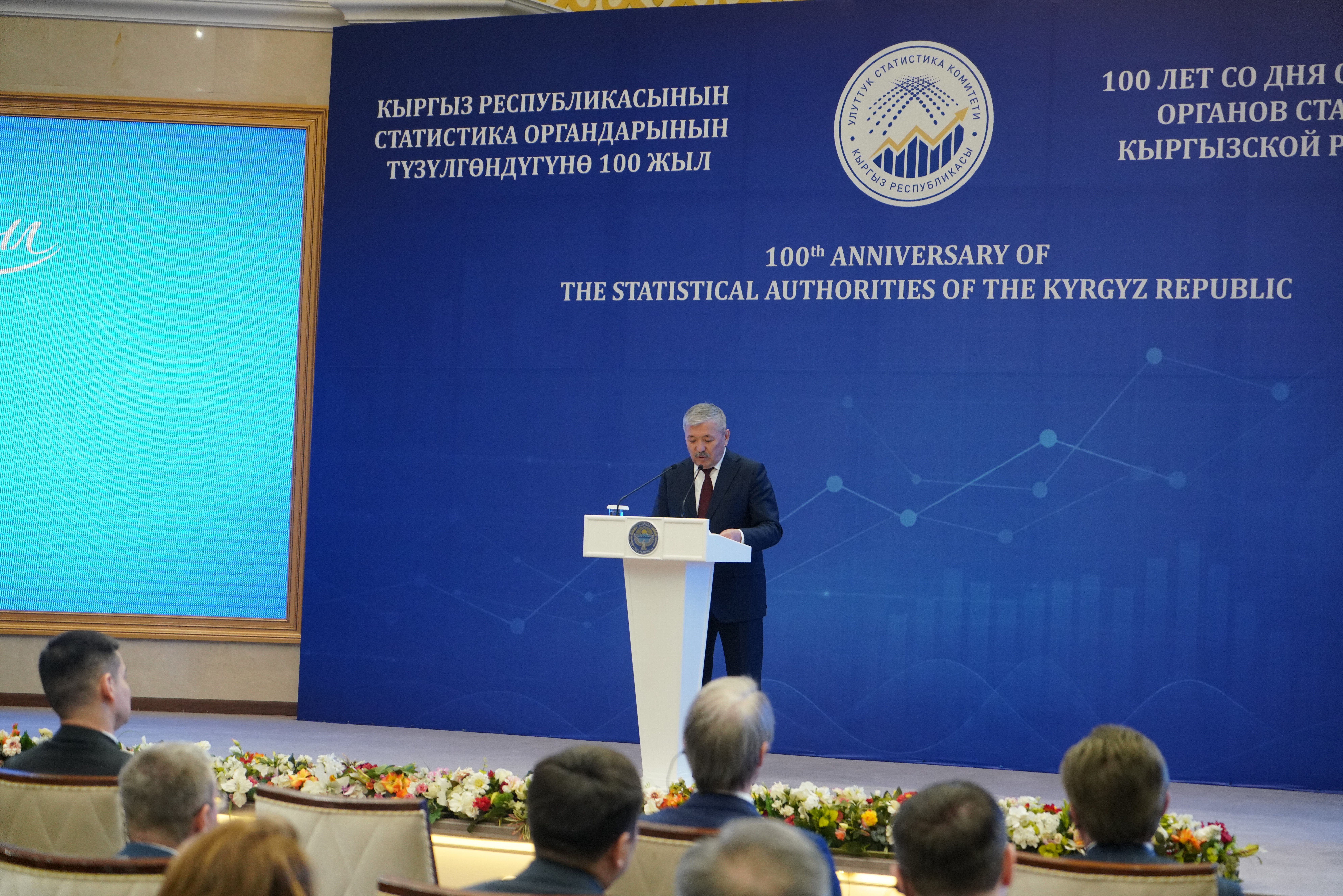 Куттуктоо сөзү менен Кыргыз Республикасынын Улуттук статистика комитетинин төрагасы Бактыбек Кудайбергенов сөз сүйлөдү. Ал тармактын жүз жылдык тарыхы - бул тактыкты, объективдүүлүктү жана кесиптик жоопкерчиликти күнүмдүк ишинин негизине айланткан көптөгөн муундардын эмгегинин жыйынтыгы экенин белгиледи.