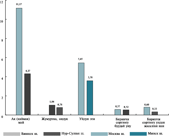2020-жылдын мартында орточо чекене бааларынын деңгээли Бишкек шаарында пастеризацияланган сүткө Нур-Султан шаарында – 11,1 пайызга жана Минск шаарында – 12,5 пайызга, уй этине Минск шаарында – 26,9 пайызга, ал эми биринчи сорттогу ундан жасалган нанга Нур-Султан шаарында – 45,0 пайызга, Минск шаарында – 11,7 пайызга байкалган баалардан жогору болуп түзүлдү. Муну менен бирге, 2020-жылдын мартында жумурткага болгон орточо керектөө баалар Бишкек шаарында Нур-Султан шаарындагы баалардын деңгээлинен 24,3 пайызга ашты.