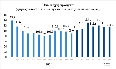 Ички дүң продукт (ИДП) алдын-ала баалоо боюнча 2025-жылдын январь-июлунда өткөн жылдын январь-июлуна салыштырмалуу 11,5 %га жогорулап, 865,2 млрд. сомду түздү.