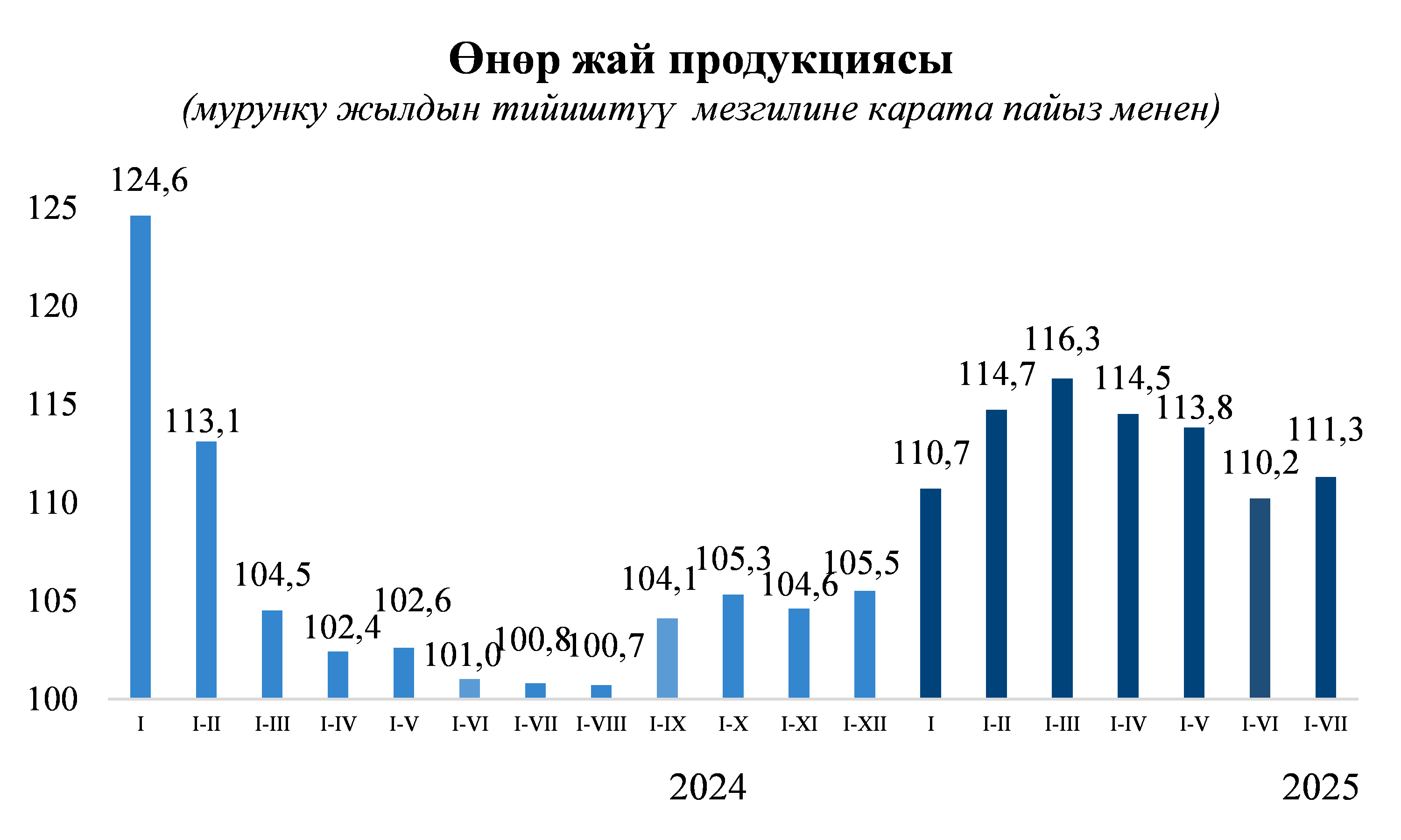 Өнөр жай өндүрүшүнүн өсүшү 2024-жылдын январь-июлуна салыштырмалуу фармацевтика- лык продукциялардын (2,4 эсеге), тамак-аш азыктарын (суусундуктарды кошкондо) жана тамеки азыктарын өндүрүүнүн (49,0 пайызга), резина, пластмасса буюмдарын жана курулуш материалдарын өндүрүүнүн (33,5 пайызга), жыгачтан жана кагаздан жасалган буюмдарды өндүрүүнүн, полиграфиялык ишмердүүлүк продукцияларынын (30,6 пайызга), химиялык продукциялардын (29,3 пайызга),тазаланган мунайзат продуктуларынын (5,8 пайызга), ошондой эле пайдалуу кендерди казуу көлөмүнүн (14,6 пайызга) көбөйүшү менен камсыздалды.