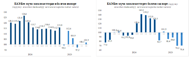 2025-жылдын январь-июнунда ЕАЭБге мүчө мамлекеттер менен өз ара сооданын көлөмү 2 247,6 млн. АКШ долларын түздү жана 2024-жылдын январь-июнуна салыштырмалуу 6,2 пайызга төмөндөдү. Бул мезгилде республиканын өз ара соодасынын эң көп үлүшү Россияга (65,7 пайыз) жана Казакстанга (32,1 пайыз) туура келди.