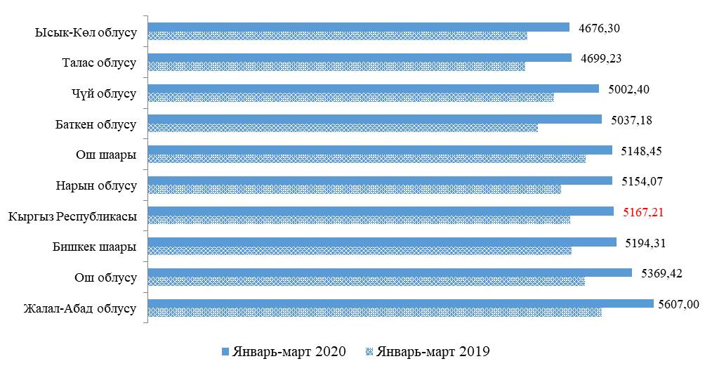 2020-жылдын I кварталында жашоо минимумунун нарктык чоңдугу жан башына 5167,21 сомду түзүп, өткөн жылдын тиешелүү мезгилине салыштырганда 10,4 пайызга өстү. Кыргыз Республикасынын бардык аймактарында январь-март айларында жашоо минимумунун нарктык чоңдугунун өсүшү белгиленди.