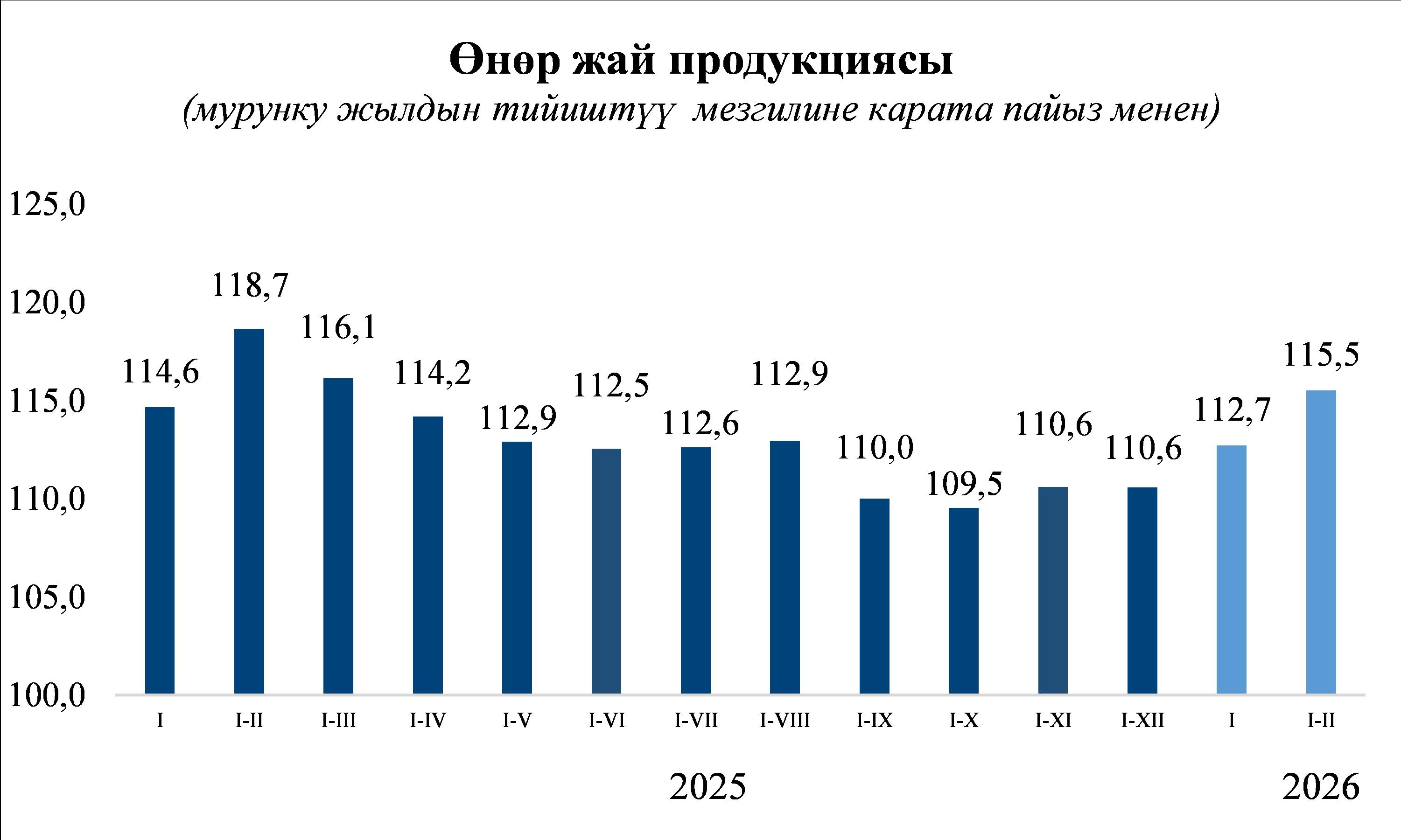 Өнөр жай. Өнөр жай өндүрүшүнүн 2025-жылдын январь–февралына салыштырмалуу өсүшү химиялык продукциялардын (3,1 эсеге), фармацевтикалык продукциялардын (1,7 эсеге), резина жана пластмасса буюмдарынын, курулуш материалдарынын, жыгачтан жана кагаздан жасалган буюмдардын, полиграфиялык ишмердүүлүк продукцияларынын (1,6 эсеге), транспорт каражаттарынын (42,4 пайызга), тамак-аш азыктарынын (суусундуктарды кошкондо) жана тамеки продукцияларынын (16,8 пайызга), тазаланган мунай продукцияларынын (18,2 пайызга), негизги металлдардын (11,1 пайызга), ошондой эле пайдалуу кендерди казуу көлөмүнүн (47,2 пайызга) көбөйүшү менен камсыздалды.