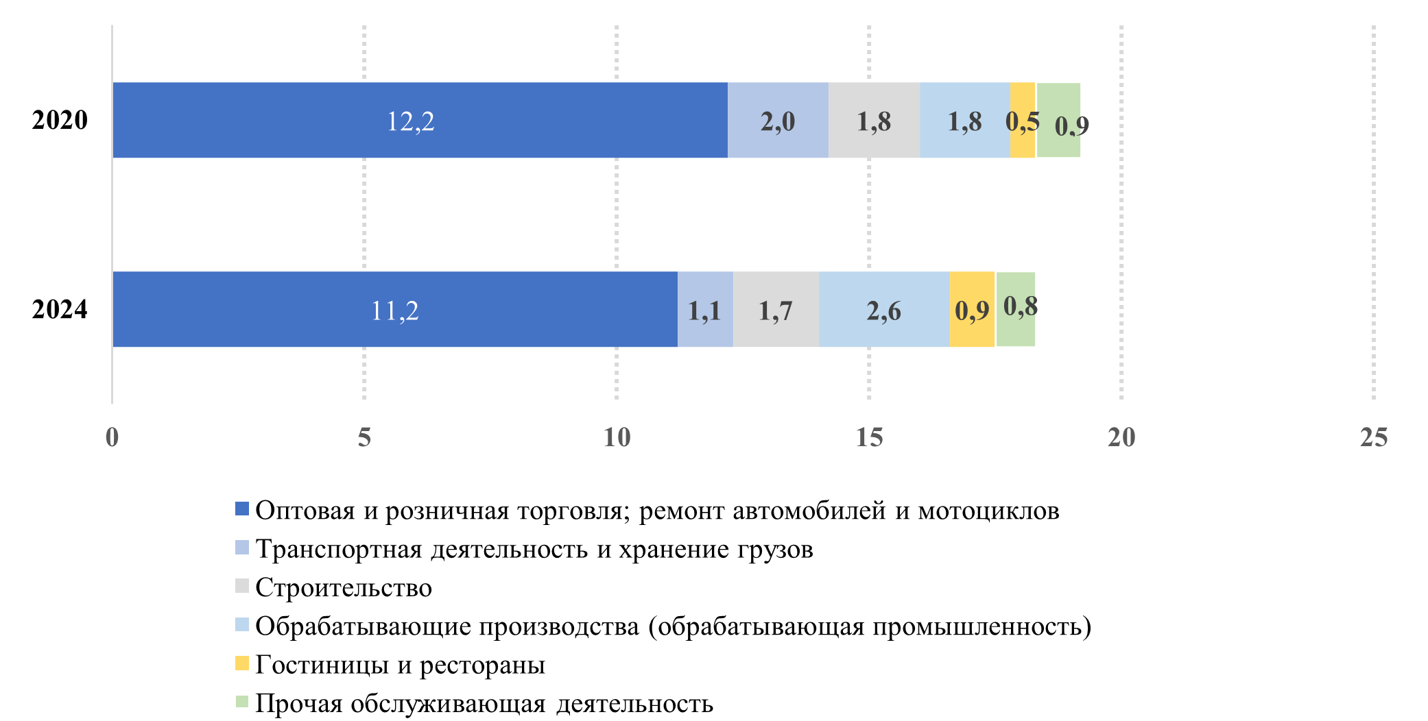 По сравнению с 2020 годом доля ненаблюдаемой экономики в 2024 году снизилась на 0,6 процентных пункта, что обеспечено сокращением ее доли в сфере оптовой и розничной торговли; ремонта автомобилей и мотоциклов (на 1 процентный пункт) и транспортной деятельности и хранения грузов (на 0,9 процентных пункта).