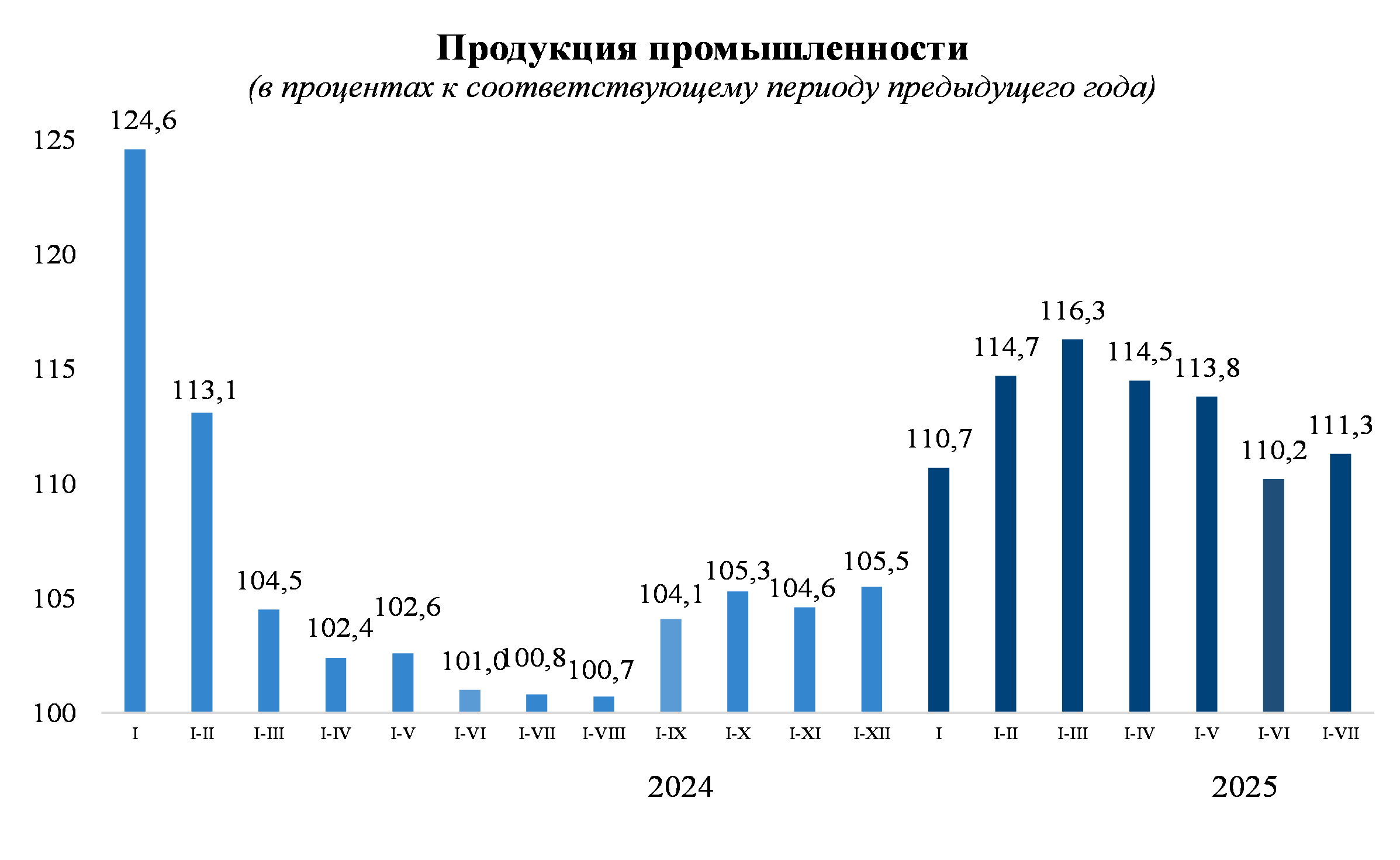 Рост промышленного производства по сравнению с январем-июлем 2024 года обеспечен повышением объемов производства фармацевтической продукции (в 2,4 раза), пищевых продуктов (включая напитки) и табачных изделий (на 49,0 процента), резиновых, пластмассовых изделий и строительных материалов (на 33,5 процента), деревянных и бумажных изделий, продукции полиграфической деятельности (на 30,6 процента), химической продукции (на 29,3 процента), очищенных нефтепродуктов (на 5,8 процента), а также добычи полезных ископаемых (на 14,6 процента).