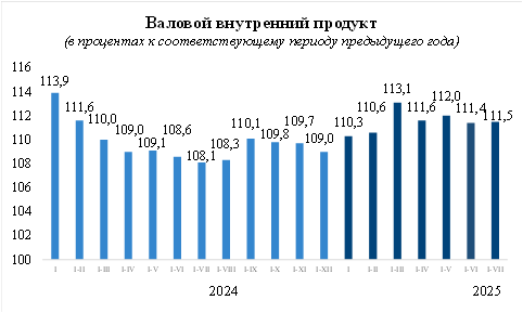 Валовой внутренний продукт в январе-июле 2025 года, по предварительной оценке, составил 865,2 миллиарда сомов и по сравнению с январем-июлем 2024 года увеличился на 11,5 процента.