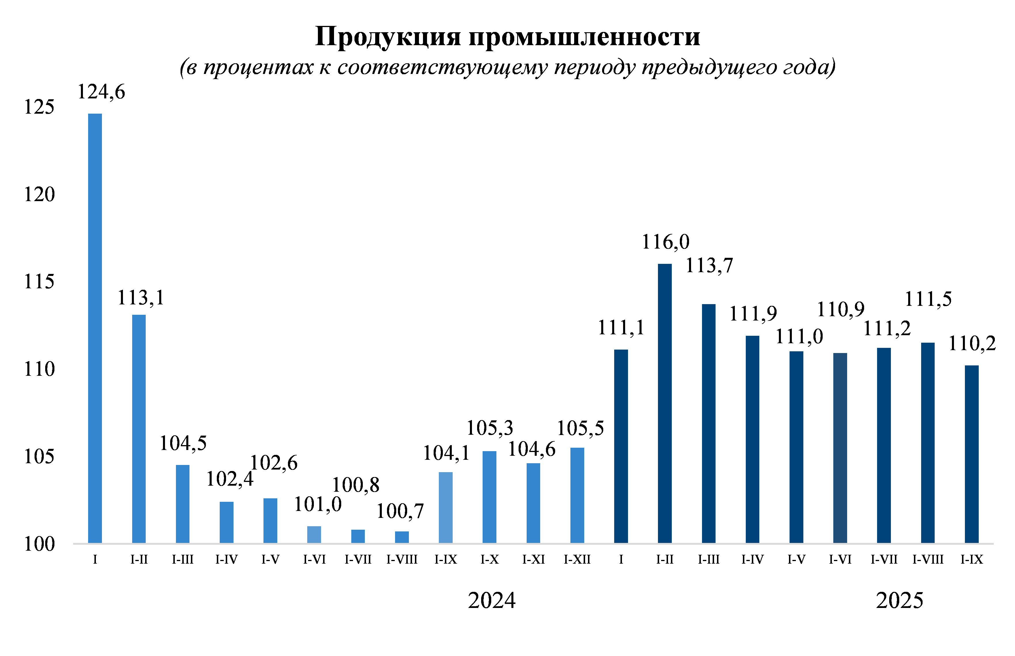 Рост промышленного производства по сравнению с январем-сентябрем 2024 года обеспечен повышением объемов производства фармацевтической продукции (в 2,3 раза), пищевых продуктов (включая напитки) и табачных изделий (на 40,1 процента), резиновых, пластмассовых изделий и строительных материалов (на 31,8 процента), деревянных и бумажных изделий, продукции полиграфической деятельности (на 28,7 процента), химической продукции (на 17,7 процента), в текстильном производстве, производстве одежды (на 8,5 процента), а также добычи полезных ископаемых (на 16,3 процента).