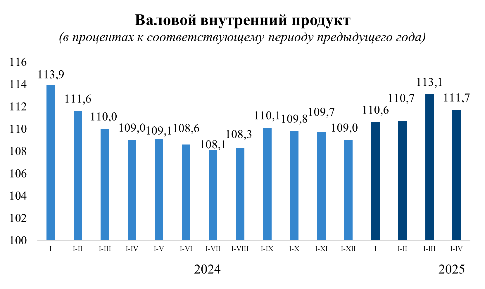Валовой внутренний продукт в январе-апреле 2025 года, по предварительной оценке, составил 442,4 миллиарда сомов и по сравнению с январем-апрелем 2024 года увеличился на 11,7 процента.