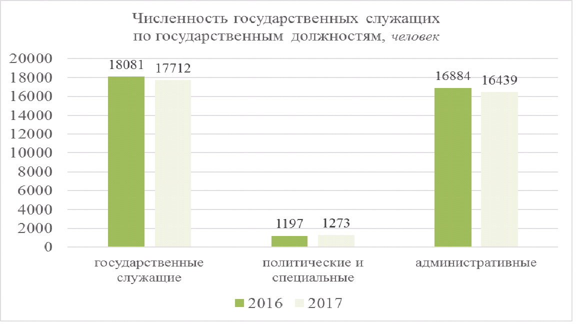 Численность государственных служащих на 1 января 2017г. составила 17,7 тыс. человек и по сравнению с соответствующей датой прошлого года снизилась на 2 процента. При этом на долю занимающих политические и специальные должности пришлось 7,2 процента, на административные 92,8 процента.