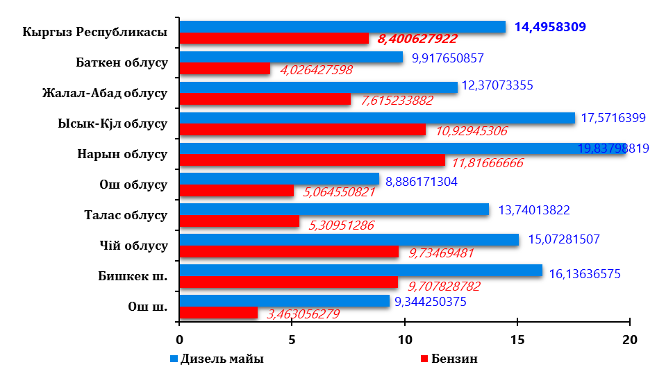 Үстүбүздөгү жылдын сентябрында 2017-ж. жылдын декабрына салыштырмалуу дизель майына болгон баалардын максималдуу өсүшү (19,8 пайыз) жана бензинге болгон (11,8 пайыз) Нарын облусунда катталды. Ошол эле убакта, дизель майына болгон алардын минималдуу өсүүсү (8,9 пайыз) Ош облусунда, бензинге (3,5 пайыз) Ош шаарында белгиленген.
