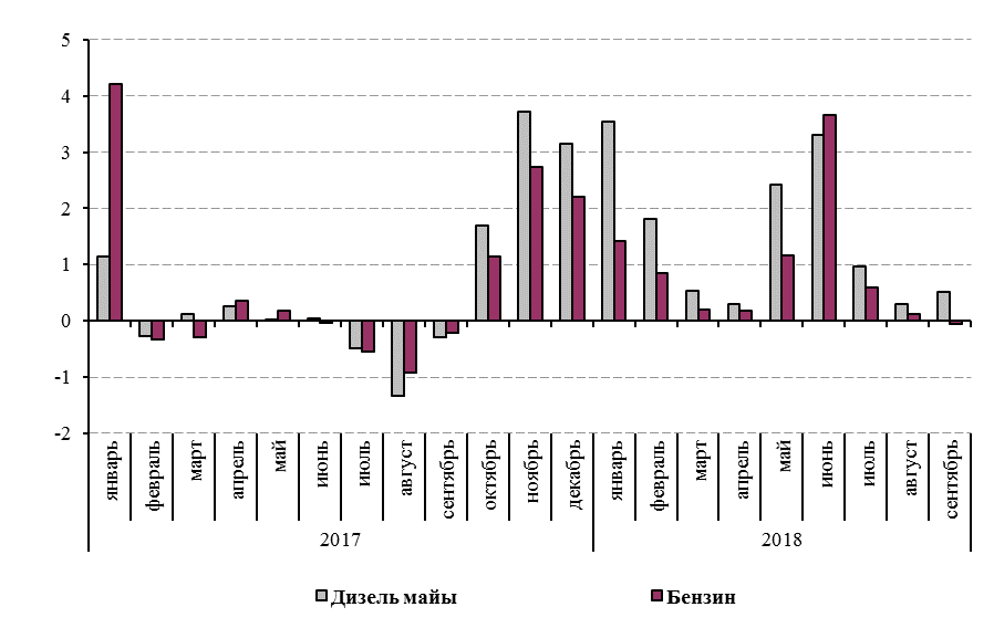 2017-жылдын октябрынан тартып 2018-жылдын августуна чейин бензинге жана дизель майына карата баалар туруктуу түрдө өстү. Үстүбүздөгү жылы дизель майына болгон баалардын өзгөчө курч көтөрүлүшү январда (3,5 пайызга мурунку айга салыштырмалуу), июнунда - бензинге (3,7 пайызга мурунку айга салыштырмалуу) байкалган. 2018-жылдын сентябрында баалар дизель майына 0,5 пайызга өстү, ал эми бензинге – бир аз төмөндөдү.
