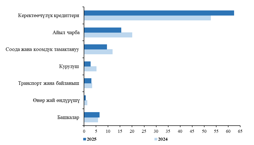 2025-жылдын 9 айында калкка берилген микрокредиттердин жалпы көлөмүнүн 62%дан ашыгы - керектөө муктаждыктарына, 15%дан ашык - айыл чарба ишмердиктерин өнүктүрүүгө, 9,5%ы - соода жана коомдук тамактануу чөйрөсүнө багытталды. Муну менен бирге өткөн жылдын тийиштүү мезгилине салыштырганда керектөөчүлүк муктаждыктарга берилген микрокредиттердин үлүшүнүн көбөйүшү - 9,7 пайыздык пунктка байкалды, ал эми айыл чарбасына берилген микрокредиттердин үлүшү, тескерисинче, 4,6 пайыздык пунктка кыскарды.