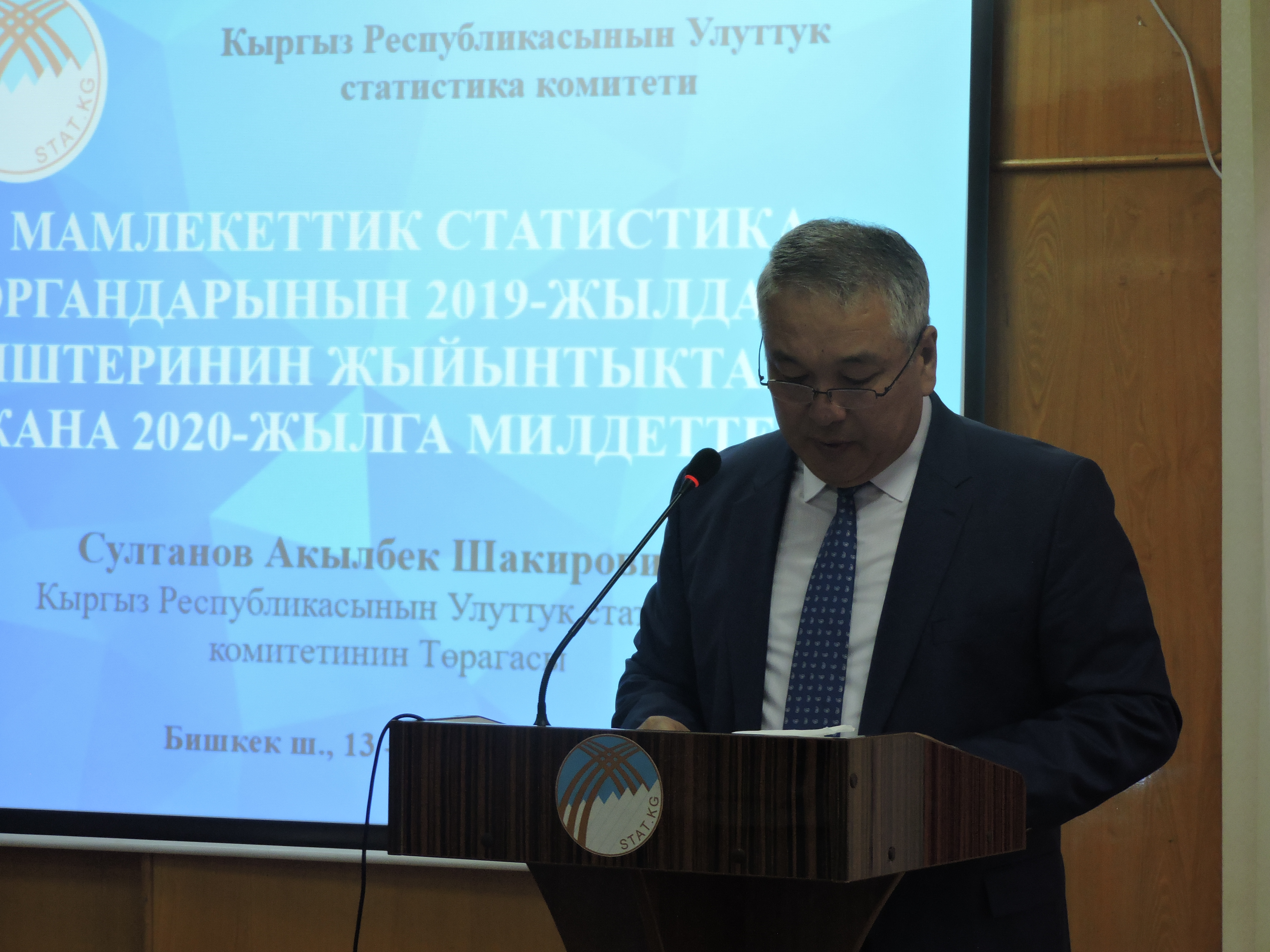Андан кийн Акылбек Султанов Улутстаткомдун 2019-жылдагы иштеринин жыйынтыктары жана 2020-жылга карата милдеттери жөнүндө доклад жасады. Айтымында 2019-жылы 2015-2019-жылдарга карата Кыргыз Республикасынын мамлекеттик статистикасын өркүндөтүү жана өнүктүрүү программасынын иш-чараларын ишке ашыруу боюнча иштер аяктады. Анын жыйынтыгында «Расмий статистика жөнүндө» Кыргыз Республикасынын мыйзамы иштелип чыкты жана кабыл алынды. Ал 2020-жылдын июль айында ишке кирмекчи.