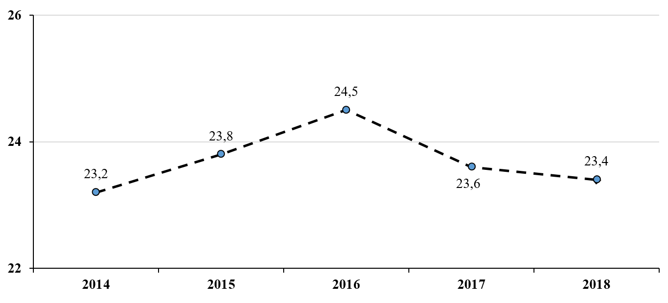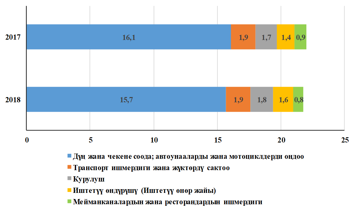 2017-жылга салыштырмалуу 2018-ж. байкоо жүргүзүлбөгөн экономиканын үлүшүнүн ИДПга карата төмөндөшү дүң жана чекене соодадагы үлүштүн – 0,4 пайыздык пунктка, кыймылсыз мүлк операциялары, мейманканалардын жана ресторандардын ишмердигиндеги үлүштүн тиешелүүлүгүнө жараша 0,1 пайыздык пункттарга төмөндөшү менен шартталды.