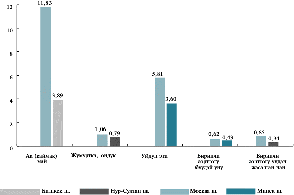 2020-жылдын апрелинде орточо чекене бааларынын деңгээли Бишкек шаарында пастеризацияланган сүткө Минск шаарында - 7,5 пайызга, уй этине Минск шаарында - 20,5 пайызга, ал эми биринчи сорттогу ундан жасалган нанга Нур-Султан шаарында – 39,3 пайызга, Минск шаарында -8,9 пайызга байкалган баалардан жогору болуп түзүлдү. Муну менен бирге, 2020-жылдын апрелинде жумурткага болгон орточо керектөө баалар Бишкек шаарында Нур-Султан шаарындагы баалардын деңгээлинен 16,0 пайызга ашты.