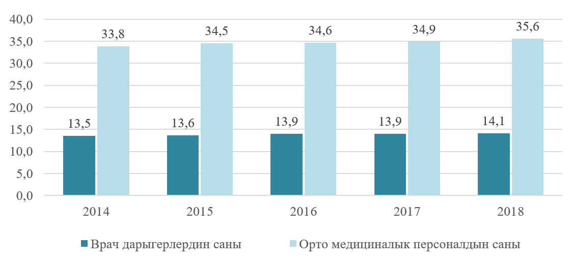 2018-жылы 14,1 миң врач дарыгерр жана 35,6 миң орто медициналык персонал медициналык-санитардык жардам көрсөтүүнү камсыз кылышты. Республиканын элинин 10 миңине деп алганда 22 врач дарыгер жана 56 орто медициналык персонал туура келди.