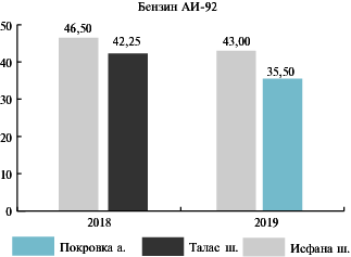Ошентип, орточо республикалык баалар 2019-жылдын августунда 2018-жылдын августуна салыштырмалуу АИ-92 бензининин баасы 3,92 сомго, же 8,9 пайызга төмөндөдү, ал эми ушул эле учурда дизелдик күйүүчү майга, тескерисинче, бир азга (11 тыйынга, же 0,2 пайызга) жогорулады.