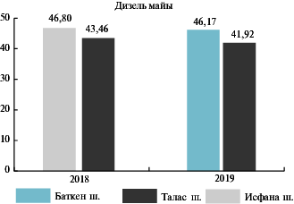Дизелдик күйүүчү майга карата айтсак, максималдуу чекене баалары Кара-Суу шаарында (бир литри - 46,22 сом), Баткен шаарында (бир литри - 46,17 сом) жана Исфана шаарында (бир литри – 46,00 сом) катталган. Муну менен катар, дизелдик күйүүчү майга карата минималдуу баалар Покровка айылында (бир литри - 42,70 сом), Талас шаарында (бир литри – 41,92 сом литр) жана Токмок шаарында (бир литри – 42,39 сом) белгиленди.