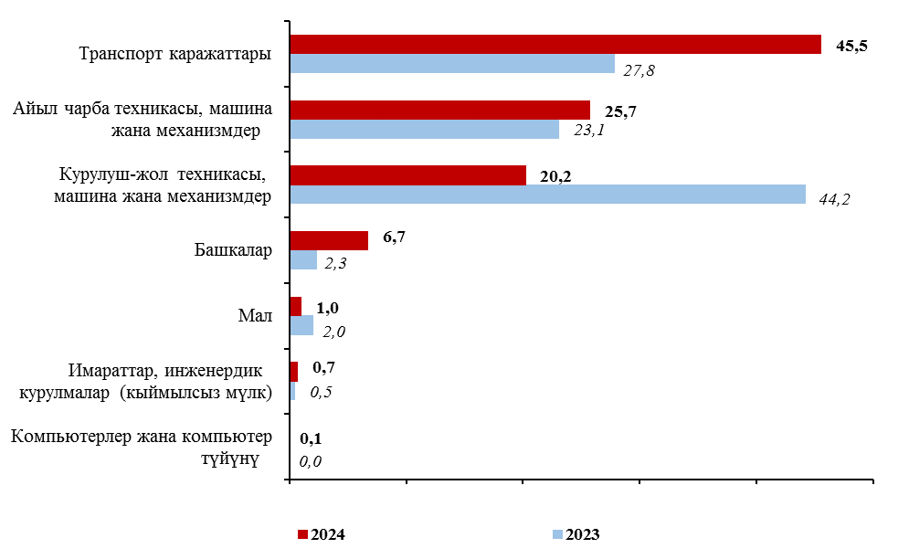 Ошол эле учурда лизинг предмети болгон айыл чарба техникалары, машиналары жана механизмдери болгон контракттардын наркынын үлүшү 2023-жылдагы 23%дан 2024-жылы 26%га чейин өскөн, ал эми жол куруу техникасынын лизингдик келишимдеринин наркынын үлүшү тескерисинче, 24 пайыздык пунктка кыскарган.