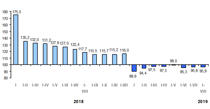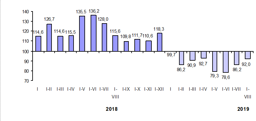 According to preliminary data, the foreign trade turnover of the Kyrgyz Republic in January-August 2019 amounted to 4.4 billion US dollars and decreased by 4.6 percent compared to January-August 2018, while export deliveries increased by 10.8 percent and import revenues, by contrast, decreased by 9.2 percent.