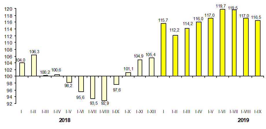 The volume of industrial production amounted to more than 196 billion soms and compared with January-September 2018, it increased by 16.5 percent due to an increase in the production of basic metals (by 39.2 percent), in textile production (by 30.1 percent), and metal mining ores (by 26.7 percent), as well as the extraction of crude oil and natural gas (by 14.1 percent).