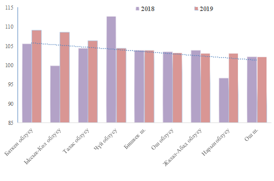 2019-жылы регионалдык дүң продуктунун эң жогорку өсүүсүнө Баткен облусу (9,0 пайызга), Ысык-Көл облусу (8,6 пайызга), Талас облусу (6,3 пайызга) жана Бишкек ш. (3,9 пайызга) жетишти.