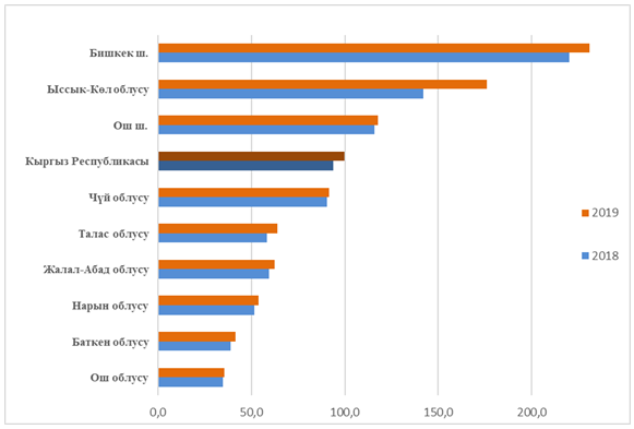 2019-жылы жалпы республика боюнча калктын киши башына ички дүң продуктунун көлөмү 100 миңге жакын сомду түздү жана өткөн жылга салыштырмалуу 6,4 пайызга көбөйдү.