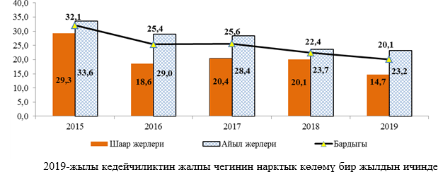 2019-жылда кедейчиликтин деңгээли жалпы өлкө боюнча 20,1 пайызды түздү, бул өткөн жылга карата 2,3 пайыздык пунктка төмөндөдү.