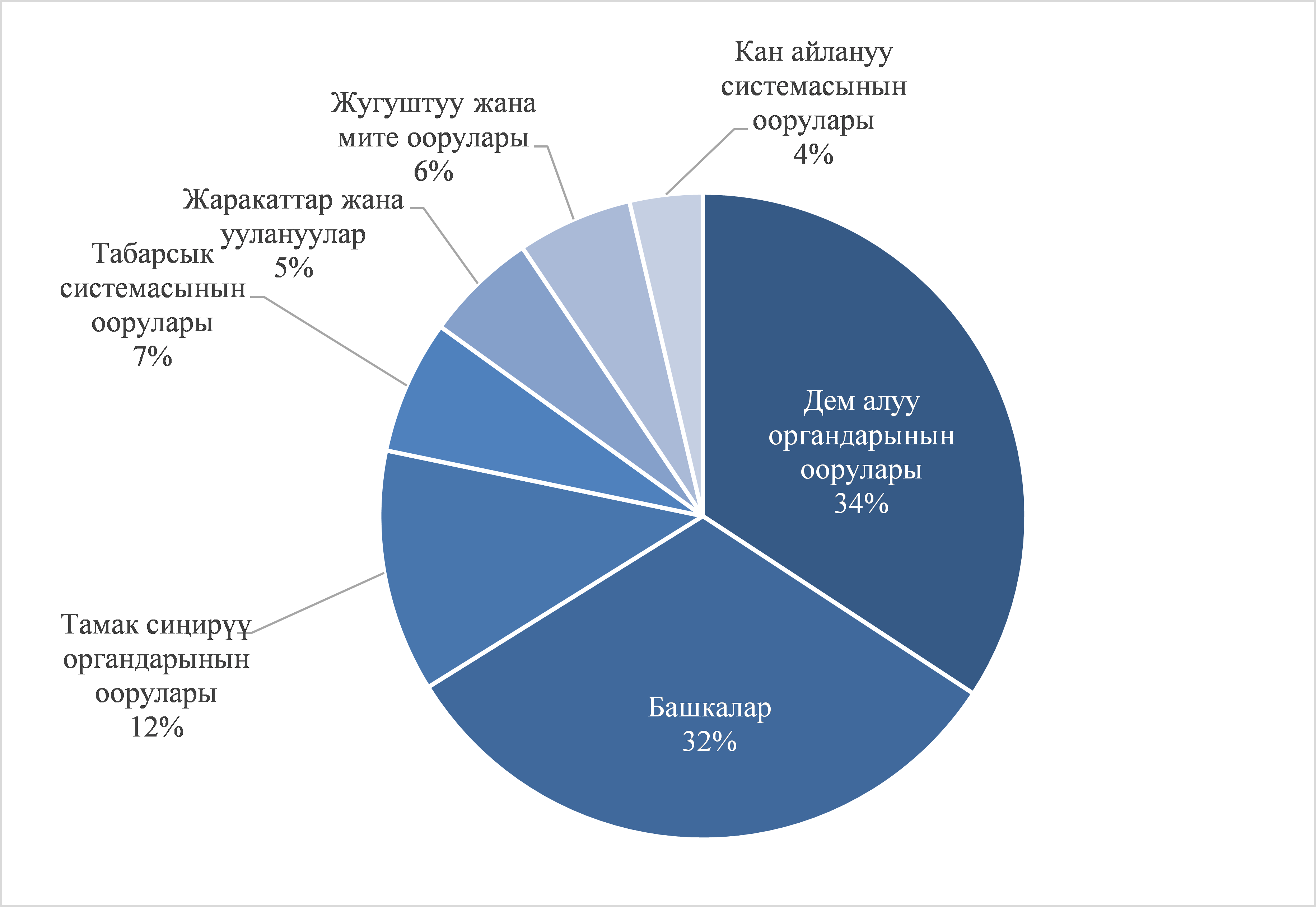 2020-ж. январь-майында[1] өлгөндөрдүн жалпы санынын ичинен жарымынан көбү (54 пайызы) кан айлануу системасынын ооруларына, 13 пайызы шишик ооруларына жана өлүмдүн тышкы себептерине жана дем алуу органдарынын ооруларына - 6 пайыздан туура келди.