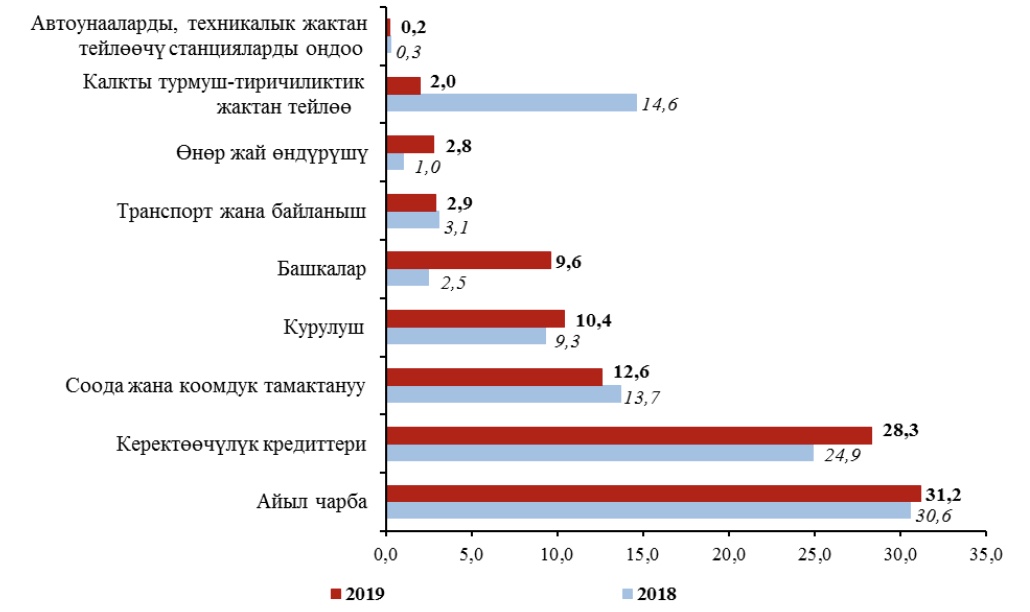 2019-жылы берилген микрокредиттердин жалпы көлөмүнүн 31,2 пайызы айыл чарбадагы ишмердикти өнүктүрүүгө, 28,3 пайызы керектөөчүлүк кредиттерине, 12,6пайызы соода жана коомдук тамак-аш чөйрөсүнө багытталды.