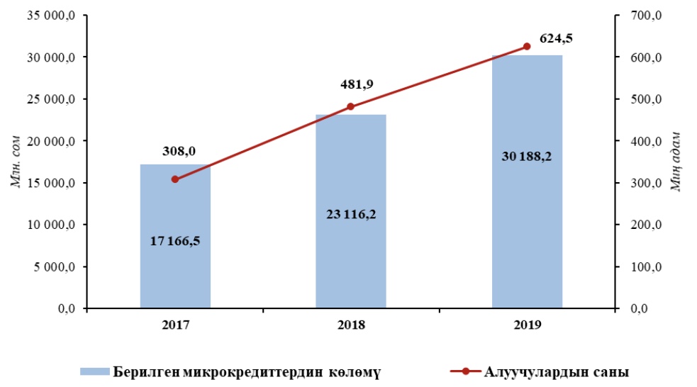 Микрокредит берүүчү уюмдар тарабынан 2019-жылы 30 188,2 млн. сом суммасында кредит берилип, алуучулардын саны 624,5 миң адамды түздү. Микрокредит алган калктын саны мурунку жылга салыштырганда 29,6 пайызга (142,6 миң адамга), ал эми берилген микрокредиттердин көлөмү 7 072,0млн. сомго көбөйгөн.