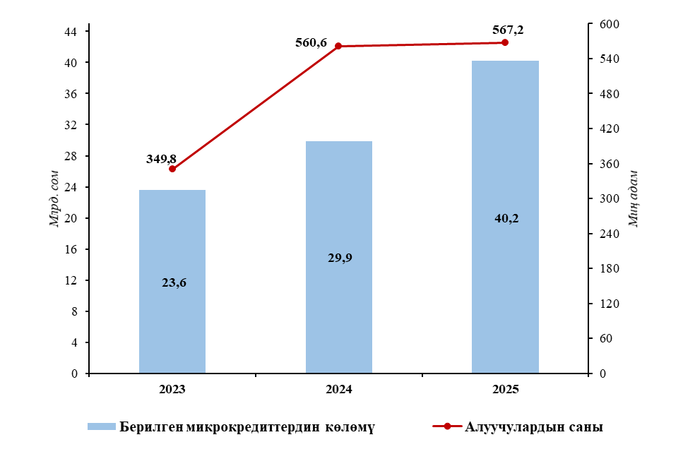 Үстүбүздөгү жылдын I жарым жылдыгында микрокредитти берүүчү уюмдар тарабынан 40 млрд. сомдон ашык суммасында кредиттер берилди, муну менен бирге алуучулардын саны 567 миң адамдан ашты. Микрокредит алган калктын саны өткөн жылдын тийиштүү мезгилине салыштырганда 1,2 пайызга, ал эми берилген микрокредиттердин көлөмү - 34 пайызга көбөйдү.