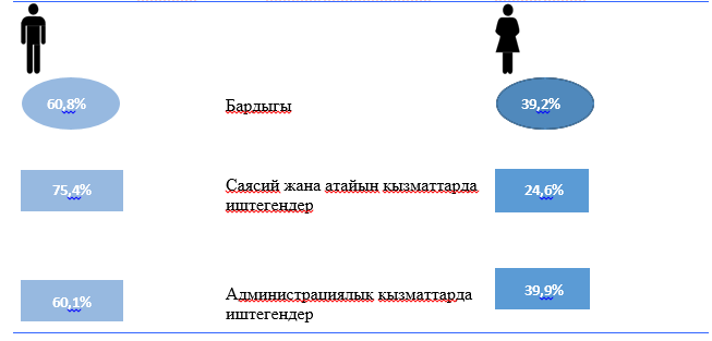 Ошого карабастан, 2019-жылы дагы, мурдагы жылдардагыдай эле мамлекеттик башкаруу органдарында иштеген мамлекеттик кызматкерлердин басымдуу бөлүгү эркектерге туура келет (60,8%). Ушундай эле тенденция жергиликтүү өз алдынча башкаруу органдарында да аныкталды, эркектердин саны аялдарга караганда көп (65,9%).