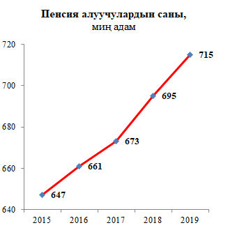 2019-жылдын аягына карата пенсия алуучулардын саны, Социалдык фонддун, башка министерликтердин жана ведомстволордун пенсиялык органдарында эсепке тургандар, 715 миң адамды түзгөн. Беш жылдын ичинде дайындалган айлык пенсиялардын орточо өлчөмү 2015-жылы 4 895 сомдон, ал эми 2019-жылы 5 960 сомго чейин өстү.