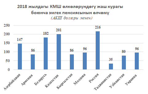 Графикте көрсөткөндөй КМШ өлкөлөрүнүн арасында эмгек пенсиясынын эң көп өлчөмү Россияда (216 доллары) жана Казакстанда (201 доллары), ал эми эң аз – Тажикстанда (35 доллары) жана Узбекистанда (80 доллары) белгиленген.