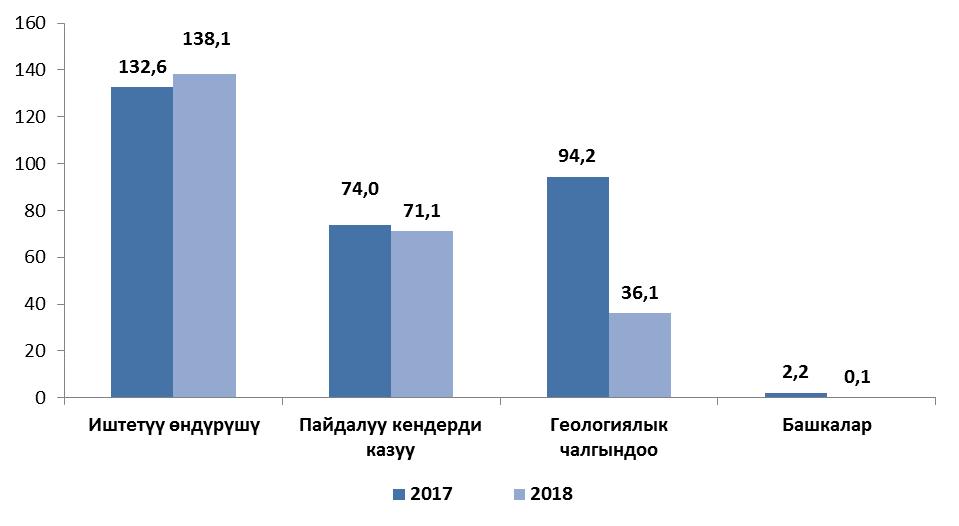 Геологиялык чалгындоого багытталган инвестициялардын олуттуу азайышынын эсебинен тике чет өлкөлүк инвестициялардын келип түшүү көлөмү 2017-жылга салыштырмалуу - 2,6 эсеге, пайдалуу кендерди казуу ишканаларына багытталган инвестициялар 4 пайызга төмөндөдү. Муну менен бирге иштетүү өндүрүшү ишканаларына инвестициялардын келип түшүү агымы көбөйдү (4 пайызга).