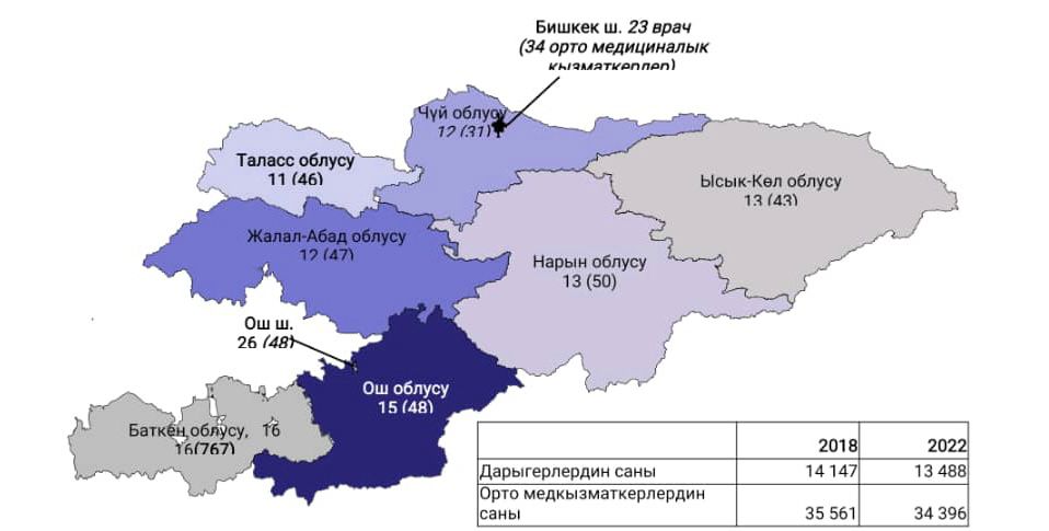 2022-жылы калкка медициналык-санитардык жардамды 13 миңден ашык дарыгерлер жана 34 миңден ашык медайымдар көрсөтүшкөн. Республиканын 10 миң калкына 19 дарыгер жана 49 медайым туура келген.