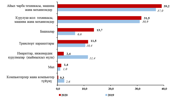 Муну менен бирге, финансылык лизинг түзүмүндө, анда имараттар, инженердик курулуштар (кыймылсыз мүлк) лизинг предмети болуп чыккан келишимдердин наркынын үлүшү 2019-жылы 11,4 пайыздан 2020-жылы 2,4 пайызга чейин кыскарды, ал эми ошол эле учурда транспорт каражаттарына (1,1 пайызга), ошондой эле айыл чарба техникасына, машина жана механизмдерге (2,2 пайызга) лизинг келишимдеринин наркынын үлүшү өстү.