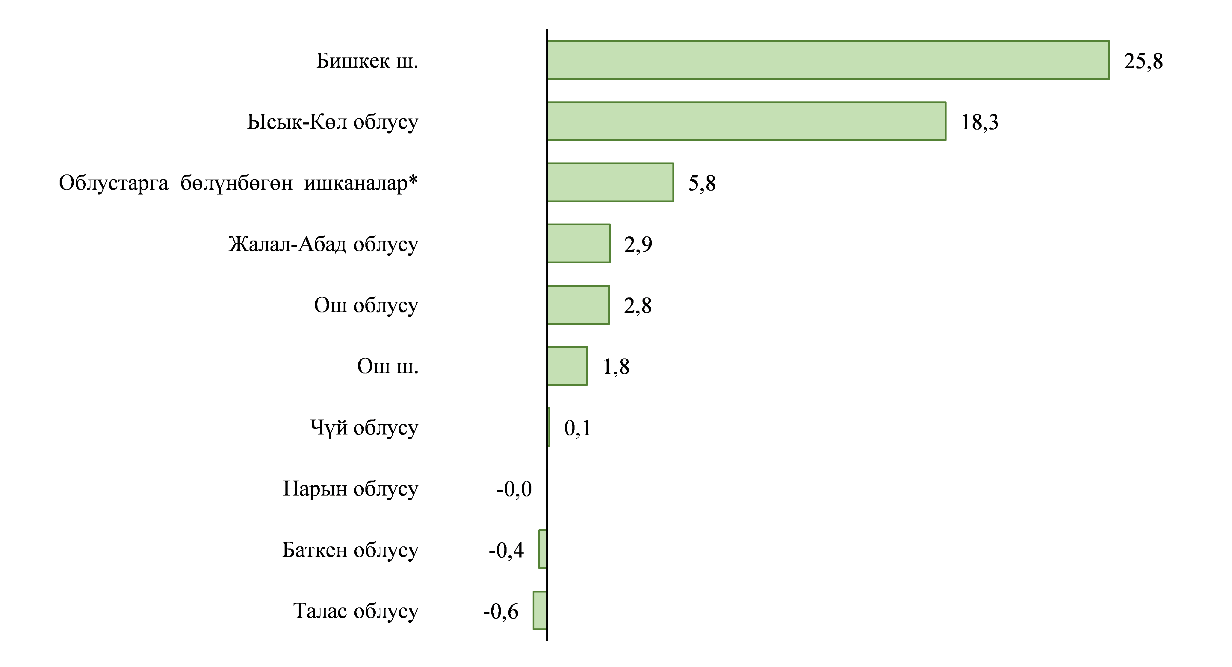 *Электр энергетика, мунайзат продуктуларын жөнөтүү жана газды бөлүштүрүү боюнча ишмердиги, почта ишмердиги жана иштетүүчү өнөр жай чөйрөлөрүндө ишмердик жүргүзүүчү республикалык маанидеги ишканалар, ошондой эле банктар.