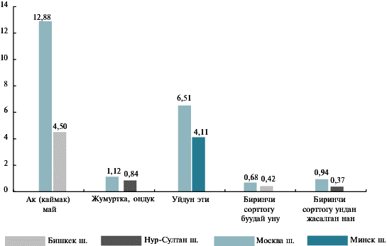 2019-жылдын сентябрында орточо чекене бааларынын деңгээли Бишкек шаарында пастеризацияланган сүткө Нур-Султан шаарында - 9,5 пайызга жана Минск шаарында - 5,4 пайызга, уй этине Нур-Султан шаарында - 2,4 пайызга, Минск шаарында - 16,6 пайызга байкалган баалардан жогору болуп түзүлдү. Муну менен бирге, 2019-жылдын сентябрында биринчи сорттогу ундан жасалган нанга болгон орточо керектөө баалар Бишкек шаарында Нур-Султан шаарындагы баалардын деңгээлинен 38,3 пайызга, жумурткага - 12,5 пайызга жана картошкага - 12,9 пайызга ашты.