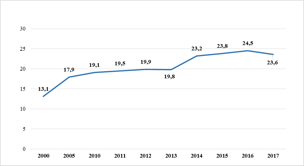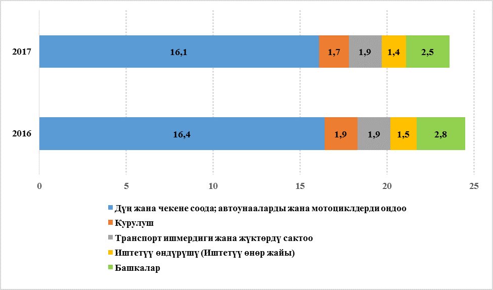 2016-жылга салыштырмалуу 2017-жылдагы байкоо жүргүзүлбөгөн экономиканын үлүшүнүн ИДПга карата төмөндөшү дүң жана чекене соодада; автоунааларды жана мотоциклдерди оңдоодо - 16,4 пайыздан 16,1 пайызга чейин ошондой эле курулушта - 1,9 пайыздан 1,7 пайызга чейин катталды.