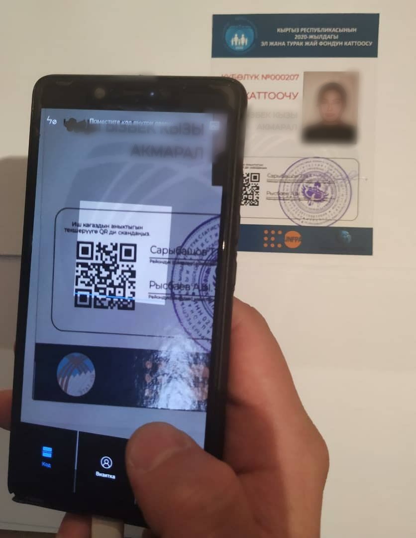 Коопсуздук жана каттоочунун күбөлүгүнүн чын экендигин текшерүү үчүн, кубөлүктүн өзүндө QR-код болот, бул ар бир каттоочу үчүн уникалдуулугу менен айырмаланат. Эгер респонденттер аларга алдамчы эмес, каттоочу келгендигине көздөрү жетиши үчүн QR-кодду сканерлөөдөн өткөрө алышат. Аны сканерлөөдөн кийин, смартфондун экранында Улуттук статкомдун серверине шилтеме чыгат, анда каттоочу жөнүндөгү маалымат: анын сүрөтү, фамилиясы, аты, атасынын аты болот. Бирок анын фамилиясы, аты, атасынын аты жазылган тамгалардын бир бөлүгү персоналдуу маалыматтардын конфиденциалдуулугун сактоо максатында жашырылып коюлат.