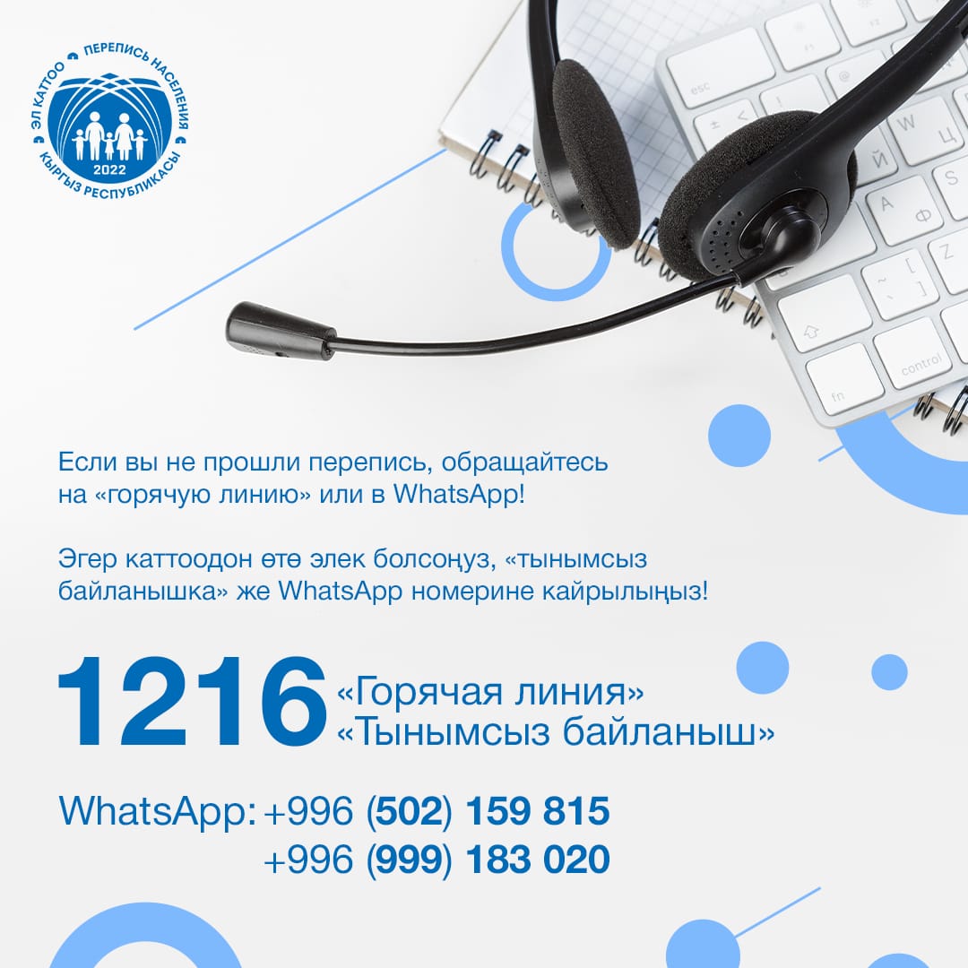 1216 «тынымсыз байланышы» каттоодон өтпөй калгандардын арызын кабыл алууну улантууда. Кошумча WhatsApp номерлерине жазсаңыз болот: +996 (502) 159 815, +996 (999) 183 020.