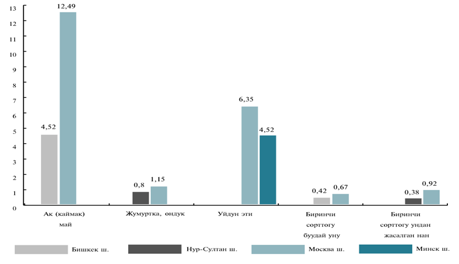 2019-жылдын майында орточо керектөө бааларынын деңгээли Бишкек шаарында пастеризацияланган сүткө Нур-Султан шаарында – 10,8 пайызга жана Минск шаарында – 8,1 пайызга, уй этине тиешел³³ - 2,1 пайызга жана 4,0 пайызга катталган баалардан жогору болуп түзүлдү. Мындан тышкары, 2019-жылдын майында биринчи сорттогу ундан жасалган нанга болгон орточо керектөө баалар Бишкек шаарында Нур-Султан шаарындагы баалардын деңгээлинен 36,7 пайызга жана жумурткага – 16,7 пайызга ашты.