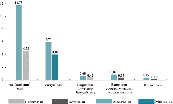 2018-жылдын октябрында орточо керектөө бааларынын деңгээли Бишкек шаарында пастеризацияланган сүткө, Астана жана Минск шаарларында (13,7 пайызга), уй этине - Астана шаарында (3,6 пайызга) жана Минск шаарында (15,7 пайызга) катталган баалардан жогору болуп түзүлдү. Ошол эле убакта, 2018-жылдын октябрында биринчи сорттогу ундан жасалган нанга болгон орточо керектөө баалар Бишкек шаарында Астана шаарындагы баалардын деңгээлинен 35,0 пайызга, жумурткага - 18,8 пайызга ашты.