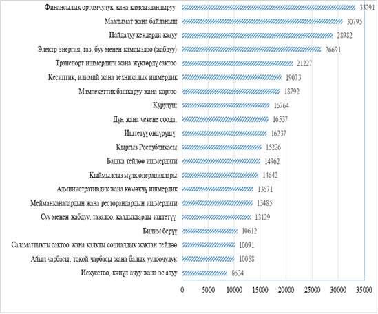 Белгилей кетүү керек, эмгек акы экономикалык ишмердиктин түрлөрү боюнча олуттуу айырмаланат жана бөлүнөт (дифференциацияланат). 2019-жылдын январь-февралында финансылык ортомчулук жана камсыздандыруу (33291 сом), маалымат жана байланыш (30795 сом), пайдалуу кендерди казуу (28982 сом), электр энергия, газ, буу жана кондицияланган аба менен камсыздоо (жабдуу) (26691 сом), транспорт ишмердиги жана жүктөрдү сактоо (21227 сом) жана кесиптик, илимий жана техникалык ишмердик чөйрөлөрүнүн (19073 сом) кызматкерлеринде бир топ жогорку эмгек акы байкалды.